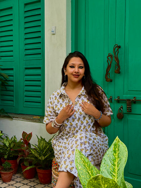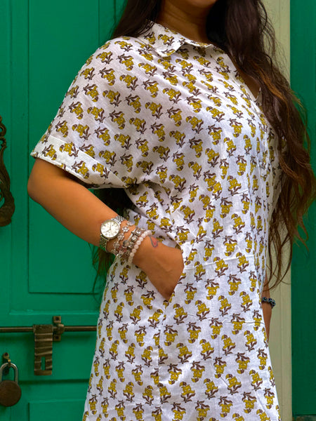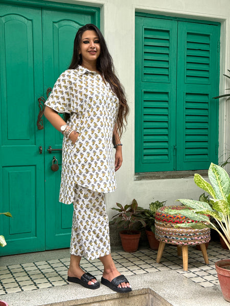 White cotton ajrakh printed shirt with raglan short sleeves. Shirt collar with placket opening & side pocket. Round hem-line with up & down detailing. Matching ajrakh printed cotton pallazo pant.